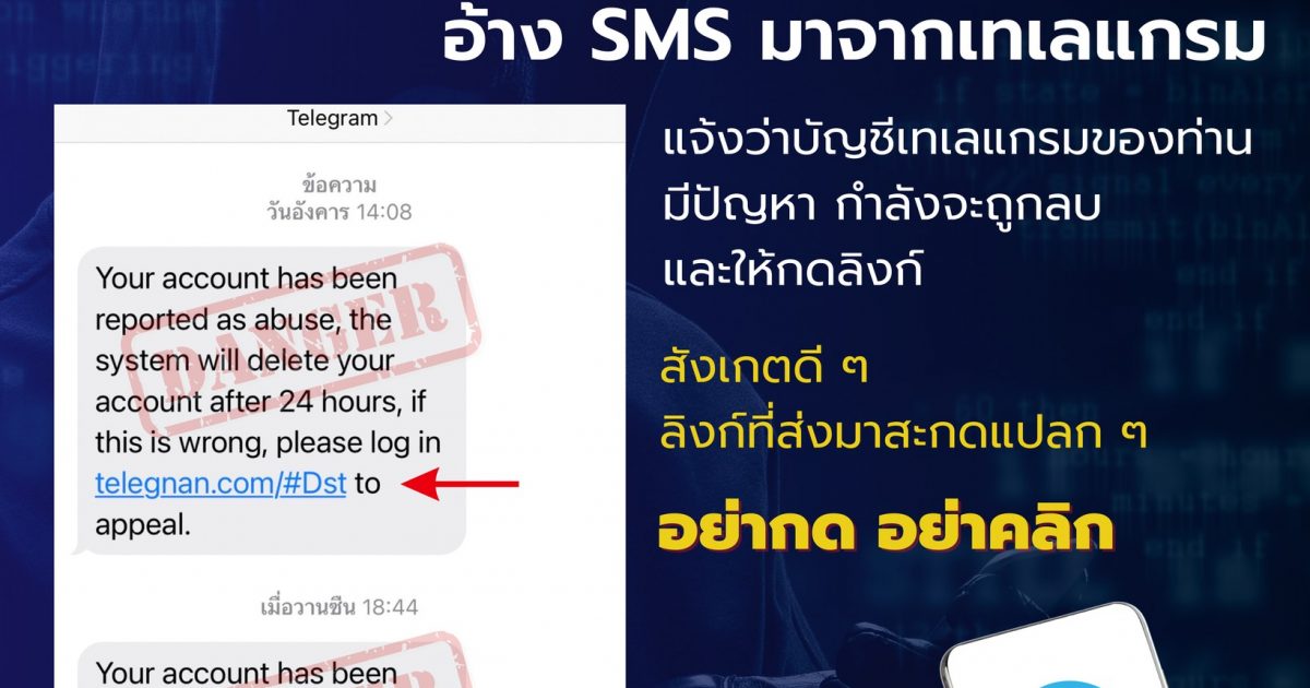 มิจฉาชีพส่งข้อความ SMS เข้ามารัว ๆ เป็นภาษาอังกฤษ อ้างว่ามาจาก Telegram ( เทเลแกรม ) แจ้งว่าบัญชีเทเลแกรมของท่านกำลังมีปัญหา และจะถูกลบทิ้งให้เข้าไปตรวจสอบตามลิงก์ที่ให้มา