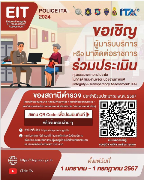 ขอเชิญ บุคคล นิติบุคคล บริษัทเอกชน หรือหน่วยงานของรัฐอื่นที่เคยเข้ารับบริการหรือมาติดต่อราชการตามภารกิจของหน่วยงาน รวมถึงคู่ค้าคู่สัญญาของหน่วยงานในปีงบประมาณ พ.ศ. 2567 ร่วมตอบแบบวัดการรับรู้ของผู้มีส่วนได้ส่วนเสียภายนอก ตามโครงการ “คุณธรรมและความโปร่งใสในการดำเนินงานของสถานีตำรวจ” ประจำปีงบประมาณ พ.ศ. 2567
