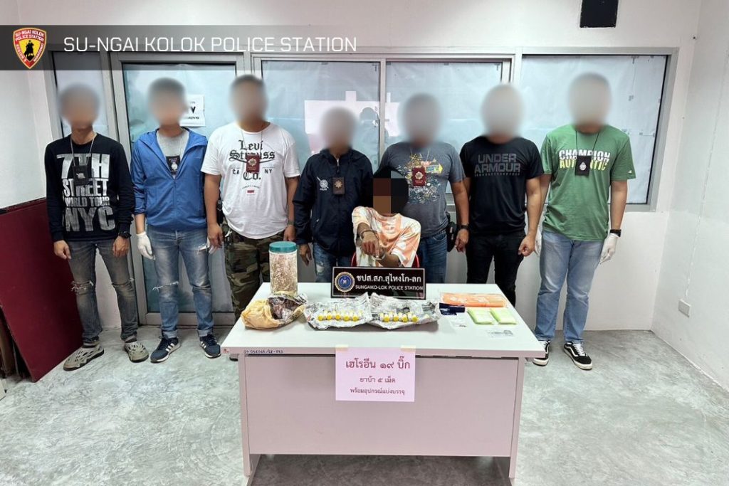จากการตรวจค้น พบ- เฮโรอีน จำนวน 19 หลอดบิ๊ก (น้ำหนักรวมประมาณ 90 กรัม) – ยาบ้า จำนวน 5 เม็ด