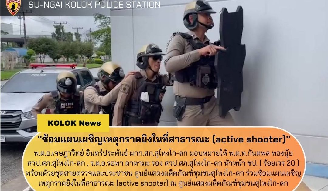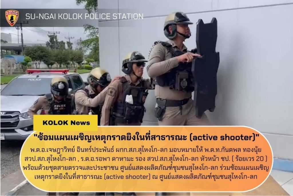 พ.ต.อ.เจษฎาวิทย์ อินทร์ประพันธ์ ผกก.สภ.สุไหงโก-ลก มอบหมายให้ พ.ต.ท.กันตพล ทองนุ้ย สวป.สภ.สุไหงโก-ลก , ร.ต.อ.รอพา ดาหามะ รอง สวป.สภ.สุไหงโก-ลก หัวหน้า ชป. ( ร้อยเวร 20 ) พร้อมด้วยชุดสายตรวจและประชาชน ศูนย์แสดงผลิตภัณฑ์ชุมชนสุไหงโก-ลก ร่วมซ้อมแผนเผชิญเหตุกราดยิงในที่สาธารณะ (active shooter) ณ ศูนย์แสดงผลิตภัณฑ์ชุมชนสุไหงโก-ลก