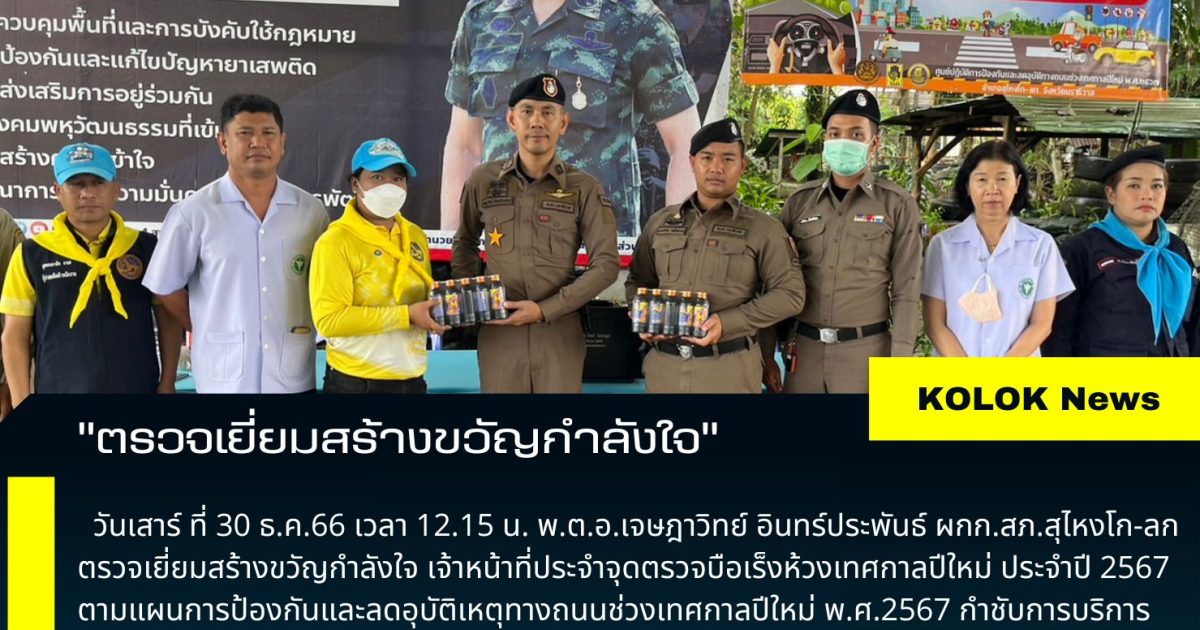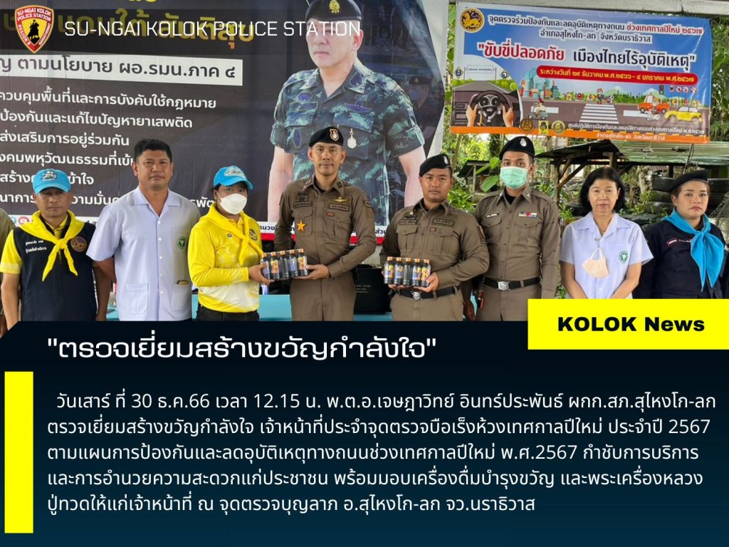 ตรวจเยี่ยมสร้างขวัญกำลังใจ เจ้าหน้าที่ประจำจุดตรวจบุญลาภห้วงเทศกาลปีใหม่ ประจำปี 2567 ตามแผนการป้องกันและลดอุบัติเหตุทางถนนช่วงเทศกาลปีใหม่ พ.ศ.2567 กำชับการบริการและการอำนวยความสะดวกแก่ประชาชน พร้อมมอบเครื่องดื่มบำรุงขวัญ และพระเครื่องหลวงปู่ทวดให้แก่เจ้าหน้าที่ ณ จุดตรวจบุญลาภ
