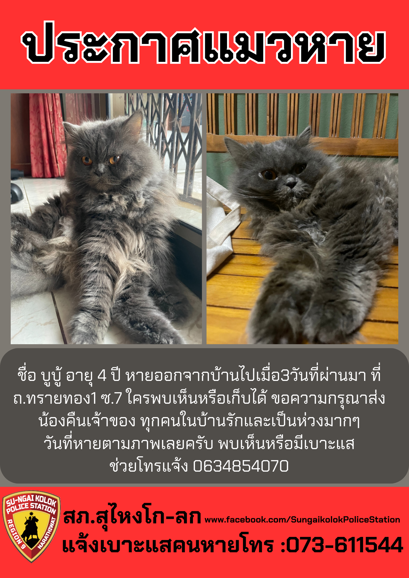 น้องชื่อ บูบู้ อายุ 4 ปี หายออกจากบ้านไปเมื่อ3วันที่ผ่านมา ที่ ถ.ทรายทอง1 ซ.7 ใครพบเห็นหรือเก็บได้ ขอความกรุณาส่งน้องคืนเจ้าของ ทุกคนในบ้านรักและเป็นห่วงมากๆ วันที่หายตามภาพเลยครับ พบเห็นหรือมีเบาะแสช่วยแจ้ง 0634854070