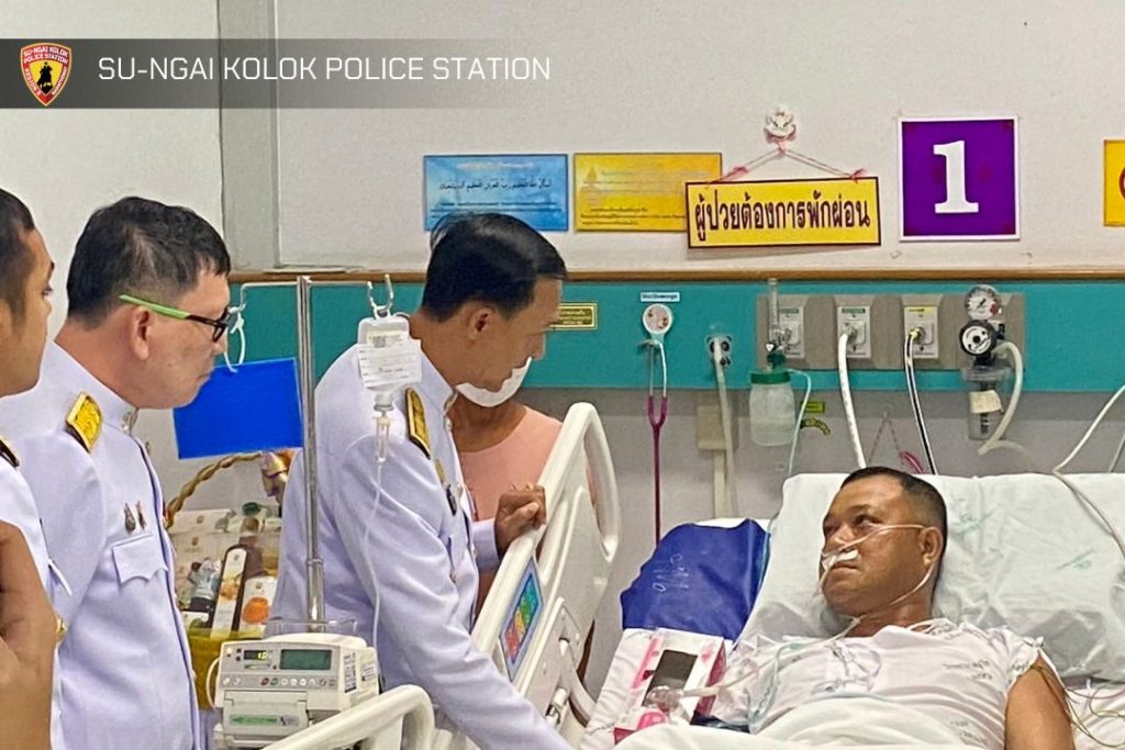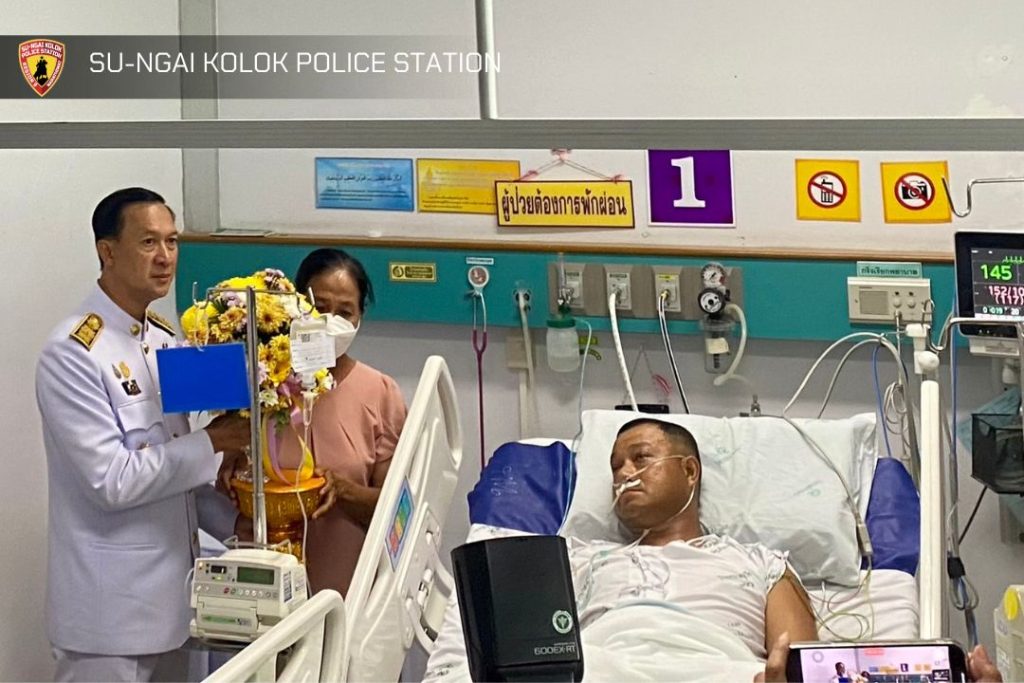 วันที่ 21 พฤษภาคม 2567 พ.ต.อ.เจษฎาวิทย์ อินทร์ประพันธ์ ผกก.สภ.สุไหงโก-ลก ร่วมเชิญแจกันดอกไม้พระราชทานและสิ่งของพระราชทานเยี่ยม จ.ส.ต.วรวิทย์ ณะรัตตะ ตำแหน่ง ผบ.หมู่ กก.ปพ.ภ.จว.นราธิวาส (ทำหน้าที่ชุดเก็บกู้วัตถุระเบิดฯ) ภ.จว.นราธิวาส ได้รับบาดเจ็บเนื่องจากเหยียบกับระเบิดขณะปฎิบัติหน้าที่ เหตุคนร้ายลอบวางระเบิดและใช้อาวุธปืนยิงใส่ อส.ชุดคุ้มครองครู เหตุเกิดบริเวณเสาสัญญาณดีแทค ม.1 ต.จวบ อ.เจาะไอร้อง จ.นราธิวาส เมื่อวันที่ 20 พ.ค.67 เวลา 08.20 น. โดยมี ว่าที่ ร.ต.ตระกูล โทธรรม ผวจ.นราธิวาส เป็นผู้แทนเชิญฯ ณ โรงพยาบาลสุไหงโก-ลก ต.สุไหงโก-ลก อ.สุไหงโก-ลก จว.นราธิวาส