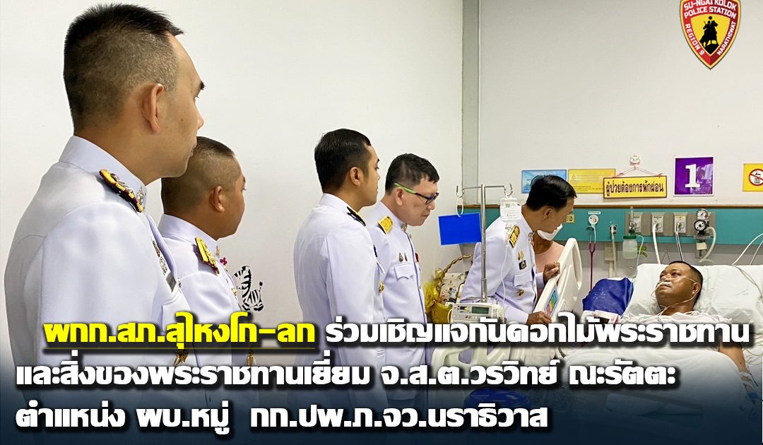 วันที่ 21 พฤษภาคม 2567 พ.ต.อ.เจษฎาวิทย์ อินทร์ประพันธ์ ผกก.สภ.สุไหงโก-ลก ร่วมเชิญแจกันดอกไม้พระราชทานและสิ่งของพระราชทานเยี่ยม จ.ส.ต.วรวิทย์ ณะรัตตะ ตำแหน่ง ผบ.หมู่ กก.ปพ.ภ.จว.นราธิวาส (ทำหน้าที่ชุดเก็บกู้วัตถุระเบิดฯ) ภ.จว.นราธิวาส ได้รับบาดเจ็บเนื่องจากเหยียบกับระเบิดขณะปฎิบัติหน้าที่ เหตุคนร้ายลอบวางระเบิดและใช้อาวุธปืนยิงใส่ อส.ชุดคุ้มครองครู เหตุเกิดบริเวณเสาสัญญาณดีแทค ม.1 ต.จวบ อ.เจาะไอร้อง จ.นราธิวาส เมื่อวันที่ 20 พ.ค.67 เวลา 08.20 น. โดยมี ว่าที่ ร.ต.ตระกูล โทธรรม ผวจ.นราธิวาส เป็นผู้แทนเชิญฯ ณ โรงพยาบาลสุไหงโก-ลก ต.สุไหงโก-ลก อ.สุไหงโก-ลก จว.นราธิวาส