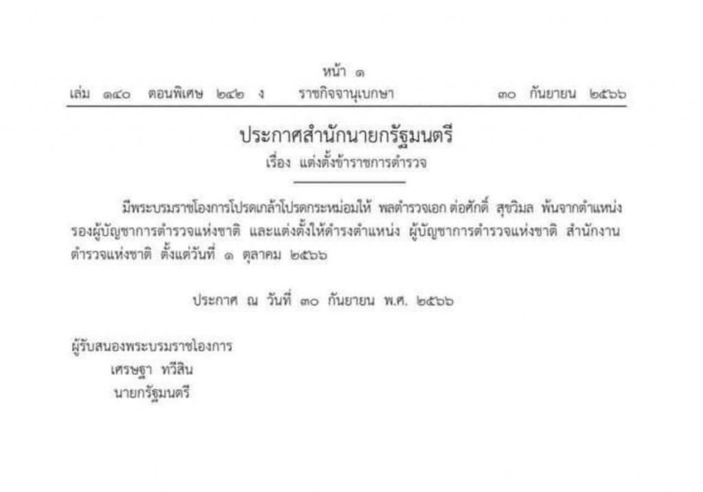 ผู้บัญชาการตำรวจแห่งชาติ คนที่ 14 3 ตุลาคม 2566 โดย admin / ข่าวประชาสัมพันธ์ พระบาทสมเด็จพระเจ้าอยู่หัว ทรงโปรดเกล้าฯ พลตำรวจเอก ต่อศักดิ์ สุขวิมล ขึ้นเป็น ผู้บัญชาการตำรวจแห่งชาติ คนที่ 14 จำนวนคนดู 1 FacebookFacebookXXLINELine