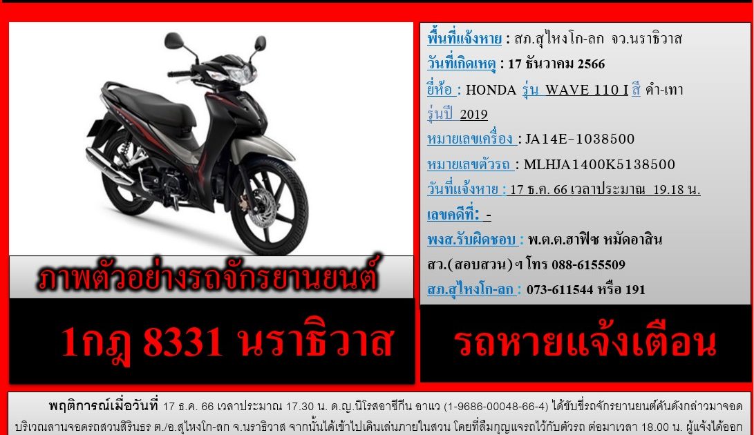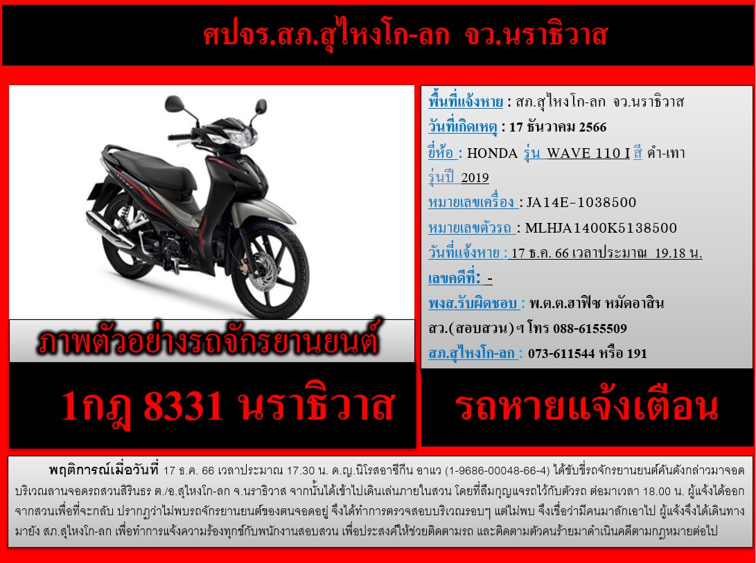 รถหายแจ้งเตือน !!! 18 ธันวาคม 2566 โดย admin / ข่าวประชาสัมพันธ์ จำนวนคนดู 16 FacebookFacebookXXLINELine