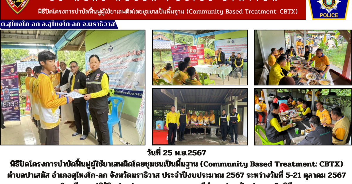 ร่วมพิธีปิดโครงการบำบัดฟื้นฟูผู้ใช้ยาเสพติดโดยชุมชนเป็นพื้นฐาน (Community Based Treatment: CBTX) ตำบลปาเสมัส อำเภอสุไหงโก-ลก จังหวัดนราธิวาส ประจําปีงบประมาณ 2567 ระหว่างวันที่ 5-21 ตุลาคม 2567 โดยมี นายปฏิวัติ เด่นอร่ามคาน นายกเทศมนตรีตำบลปาเสมัส ประธานในพิธี 25 พฤศจิกายน 2567 โดย admin / ข่าวประชาสัมพันธ์,ข่าวประชาสัมพันธ์,ข่าวฝากประชาสัมพันธ์,ข่าวภารกิจผู้บังคับบัญชา,โครงการ ณ มัสยิด หมู่ 4 ต.ปาเสมัส อ.สุไหงโก-ลก จ.นราธิวาส จำนวนคนดู 10 FacebookFacebookXXLINELine