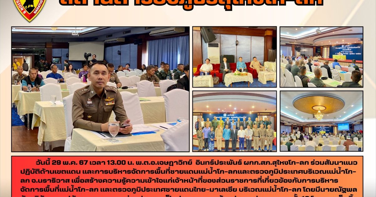 ร่วมสัมนาแนวปฏิบัติด้านเขตแดน และการบริหารจัดการพื้นที่ชายแดนแม่น้ำโก-ลกและตรวจภูมิประเทศบริเวณแม่น้ำโก-ลก จ.นราธิวาส เพื่อสร้างความรู้ความเข้าใจแก่เจ้าหน้าที่ของส่วนราชการที่เกี่ยวข้องกับการบริหารจัดการพื้นที่แม่น้ำโก-ลก และตรวจภูมิประเทศชายแดนไทย-มาเลเซีย บริเวณแม่น้ำโก-ลก