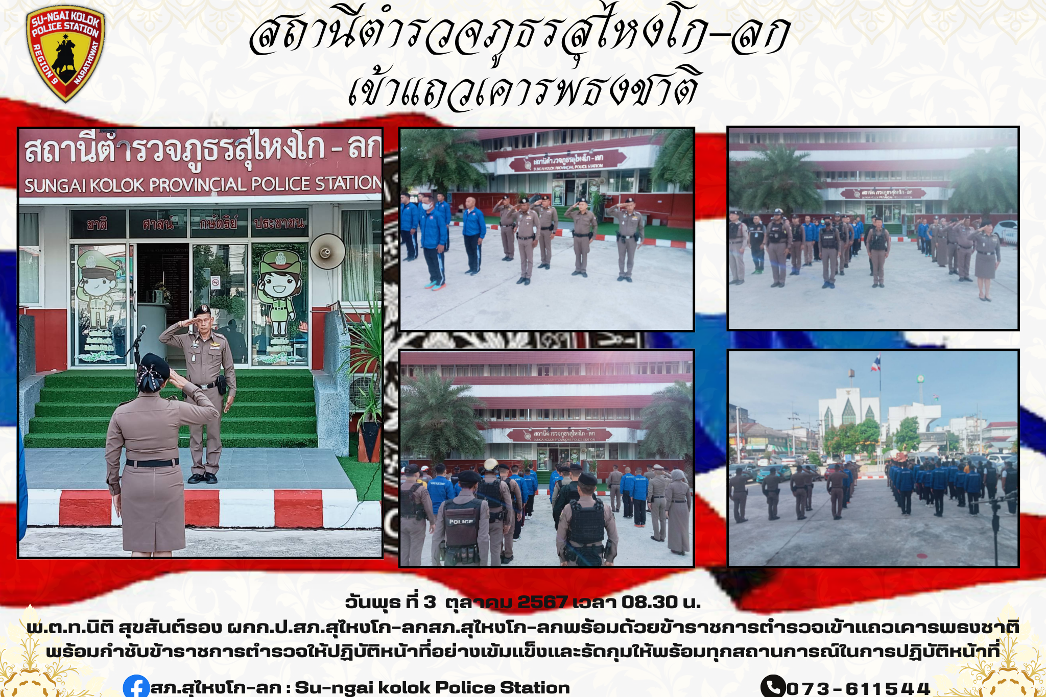 พ.ต.ท.นิติ สุขสันต์รอง ผกก.ป.สภ.สุไหงโก-ลกสภ.สุไหงโก-ลกพร้อมด้วยข้าราชการตำรวจเข้าแถวเคารพธงชาติ