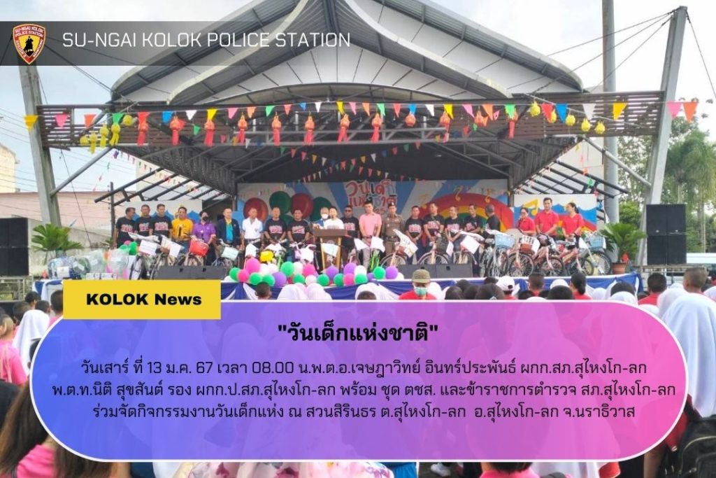 พ.ต.ท.นิติ สุขสันต์ รอง ผกก.ป.สภ.สุไหงโก-ลก พร้อม ชุด ตชส. และข้าราชการตำรวจ สภ.สุไหงโก-ลก ว.4 ร่วมจัดกิจกรรมงานวันเด็กแห่ง ณ สวนสิรินธร ต.สุไหงโก-ลก อ.สุไหงโก-ลก จ.นราธิวาส