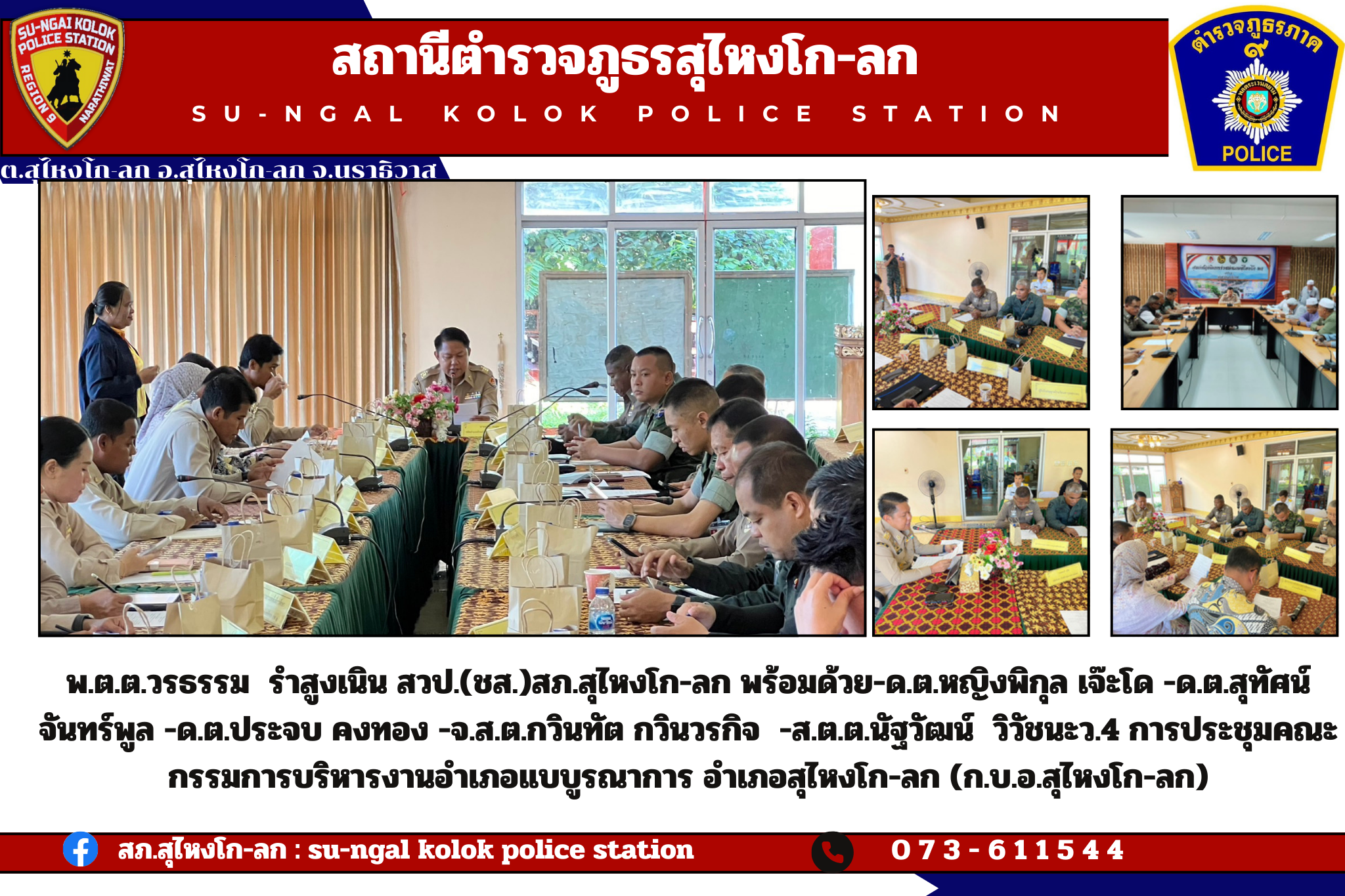 สภ.สุไหงโก-ลกภายใต้อำนวยการของพ.ต.อ.เจษฎาวิทย์ อินทร์ประพันธ์ ผกก.สภ.สุไหงโก-ลกพ.ต.ท.นิติ สุขสันต์ รอง ผกก.ป.สภ.สุไหงโก-ลกสั่งการให้พ.ต.ต.วรธรรม รำสูงเนิน สวป.(ชส.)สภ.สุไหงโก-ลกพร้อมด้วย-ด.ต.หญิงพิกุล เจ๊ะโด -ด.ต.สุทัศน์ จันทร์พูล-ด.ต.ประจบ คงทอง -จ.ส.ต.กวินทัต กวินวรกิจ -ส.ต.ต.นัฐวัฒน์ วิวัชนะว.4 การประชุมคณะกรรมการบริหารงานอำเภอแบบูรณาการอำเภอสุไหงโก-ลก (ก.บ.อ.สุไหงโก-ลก)ครั้งที่ 10/2567📍ณ ห้องประชุมโรงเรียนดารูลฟุรกอนหมู่ที่ 5 ตำบลมูโนะ อำเภอสุไหงโก-ลก จังหวัดนราธิวาส