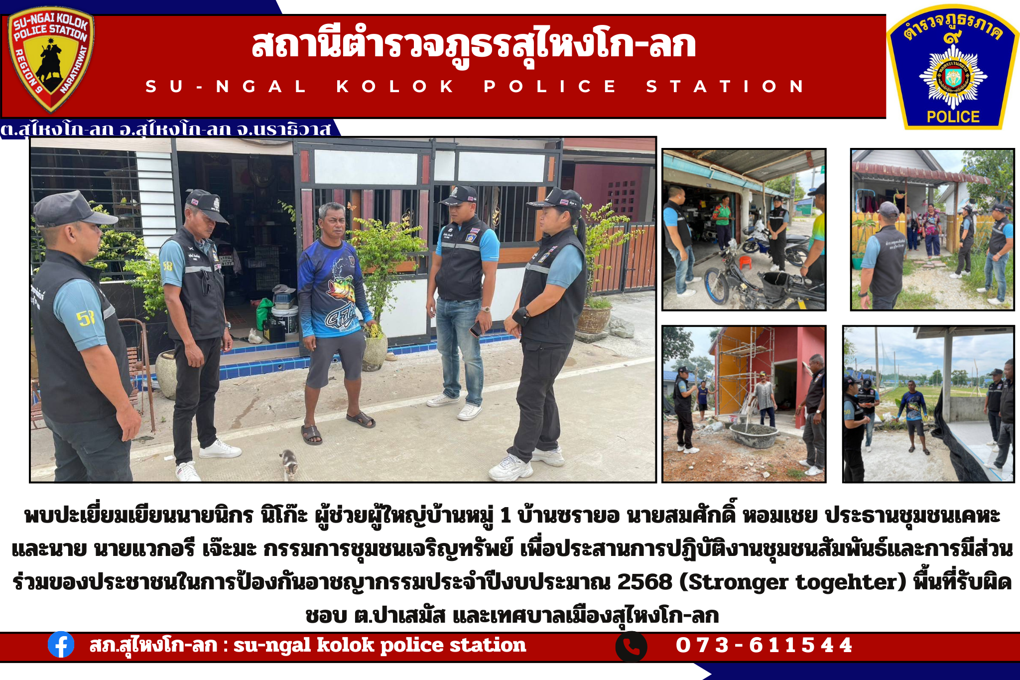 ว.4 พบปะเยี่ยมเยียนนายนิกร นิโก๊ะ ผู้ช่วยผู้ใหญ่บ้านหมู่ 1 บ้านซรายอ นายสมศักดิ์ หอมเชย ประธานชุมชนเคหะ และนาย นายแวกอรี เจ๊ะมะ กรรมการชุมชนเจริญทรัพย์ เพื่อประสานการปฏิบัติงานชุมชนสัมพันธ์และการมีส่วนร่วมของประชาชนในการป้องกันอาชญากรรมประจำปีงบประมาณ 2568 (Stronger togehter) พื้นที่รับผิดชอบ ต.ปาเสมัส และเทศบาลเมืองสุไหงโก-ลก