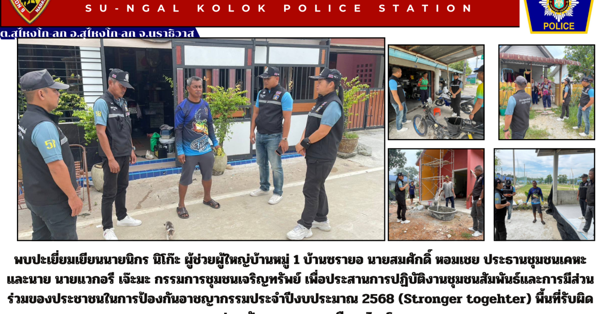ว.4 พบปะเยี่ยมเยียนนายนิกร นิโก๊ะ ผู้ช่วยผู้ใหญ่บ้านหมู่ 1 บ้านซรายอ นายสมศักดิ์ หอมเชย ประธานชุมชนเคหะ และนาย นายแวกอรี เจ๊ะมะ กรรมการชุมชนเจริญทรัพย์ เพื่อประสานการปฏิบัติงานชุมชนสัมพันธ์และการมีส่วนร่วมของประชาชนในการป้องกันอาชญากรรมประจำปีงบประมาณ 2568 (Stronger togehter) พื้นที่รับผิดชอบ ต.ปาเสมัส และเทศบาลเมืองสุไหงโก-ลก