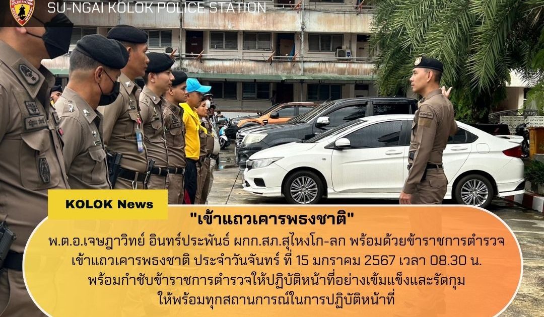 พ.ต.อ.เจษฎาวิทย์ อินทร์ประพันธ์ ผกก.สภ.สุไหงโก-ลก พร้อมด้วย ข้าราชการตำรวจเข้าแถวเคารพธงชาติ ประจำวันจันทร์ ที่ 15 มกราคม 2567 เวลา 08.30 น.พร้อมกำชับข้าราชการตำรวจ ให้ปฏิบัติหน้าที่อย่างเข้มแข็งและรัดกุม ให้พร้อมทุกสถานการณ์ในการปฏิบัติหน้าที่