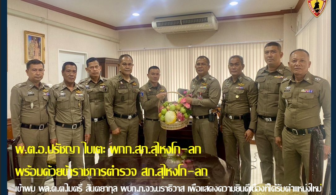 แสดงความยินดีเนื่องที่ได้รับตำแหน่งใหม่ พล.ต.ต.ไมตรี สันตยากุล ผบก.ภ.จว.นราธิวาส 9 พฤศจิกายน 2566 โดย admin / ข่าวภารกิจผู้บังคับบัญชา เมื่อวันที่ 7 พ.ย. 2566 เวลา 13.00 น. พ.ต.อ.ปรัชญา ไบเตะ ผกก.สภ.สุไหงโก-ลก, พ.ต.ท.นิติ สุขสันต์ รอง ผกก.ป.สภ.สุไหงโก-ลก พ.ต.ท.วีระนิต ใหม่ศิริ รอง ผกก.(สอบสวน)สภ.สุไหงโก-ลก, พ.ต.ท.วิสันต์ รักมาก รอง ผกก.สส.สภ.สุไหงโก-ลก พร้อมด้วยข้าราชการตำรวจ สภ.สุไหงโก-ลก เข้าพบ พล.ต.ต.ไมตรี สันตยากุล ผบก.ภ.จว.นราธิวาส เพื่อแสดงความยินดีเนื่องที่ได้รับตำแหน่งใหม่ พร้อมรับฟังนโยบาย วิสัยทัศน์ แนวทางในการทำงานเพื่อดูแลความสงบสุขของประชาชนต่อไป ณ ห้องประชุม ภ.จว.นราธิวาส จำนวนคนดู 34 FacebookFacebookXXLINELine