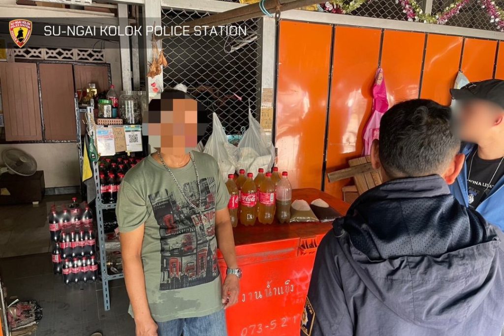 จากการตรวจค้น พบ น้ำต้มพืชกระท่อม จำนวน 6 ขวด น้ำหนักรวมภาชนะบรรจุทั้งสิ้นประมาณ 8,400 กรัม เจ้าหน้าที่ตำรวจชุดจับกุม จึงแจ้งข้อหาให้ ยอมรับว่านายหอยลายผัดน้ำพริกเผา ทราบว่า “จำหน่ายอาหารที่มีส่วนผสมของพืชกระท่อมโดยไม่ได้รับอนุญาต ฝ่าฝืนประกาศกระทรวงสาธารณสุขที่ห้ามผลิตหรือจำหน่ายพืช หรือส่วนผสมของพืชที่เป็นอาหารลำดับที่ 52 สารสกัดพืชกระท่อม (น้ำต้มพืชกระท่อม) โดยได้รับอนุญาต” ต.สุไหงโก-ลก อ.สุไหงโก-ลก จว.นราธิวาส