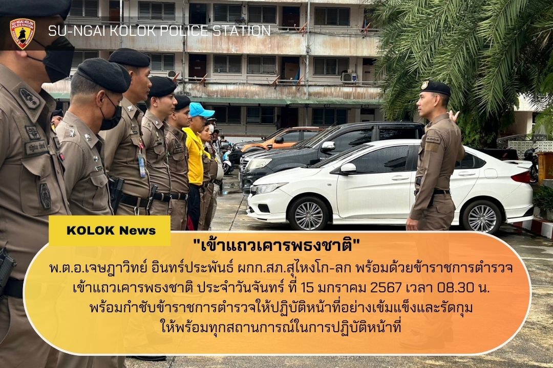 พ.ต.อ.เจษฎาวิทย์ อินทร์ประพันธ์ ผกก.สภ.สุไหงโก-ลก พร้อมด้วย ข้าราชการตำรวจเข้าแถวเคารพธงชาติ ประจำวั