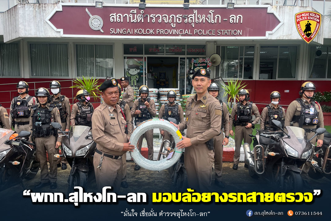 “ผกก.สุไหงโก-ลก มอบยางล้อรถสายตรวจ” สายตรวจรับมอบล้อยางรถ CBR 300 จำนวน 20 เส้น จาก พ.ต.
