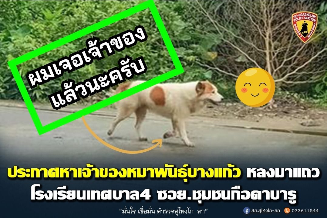 จากกรณีมีผู้พบสุนัขพันธุ์บางแก้วพลัดหลงโพสต์โซเชียล บริเวณหลงมาแถวโรงเรียนเทศบาล4 ซอย.ชุมชนกือดาบารู