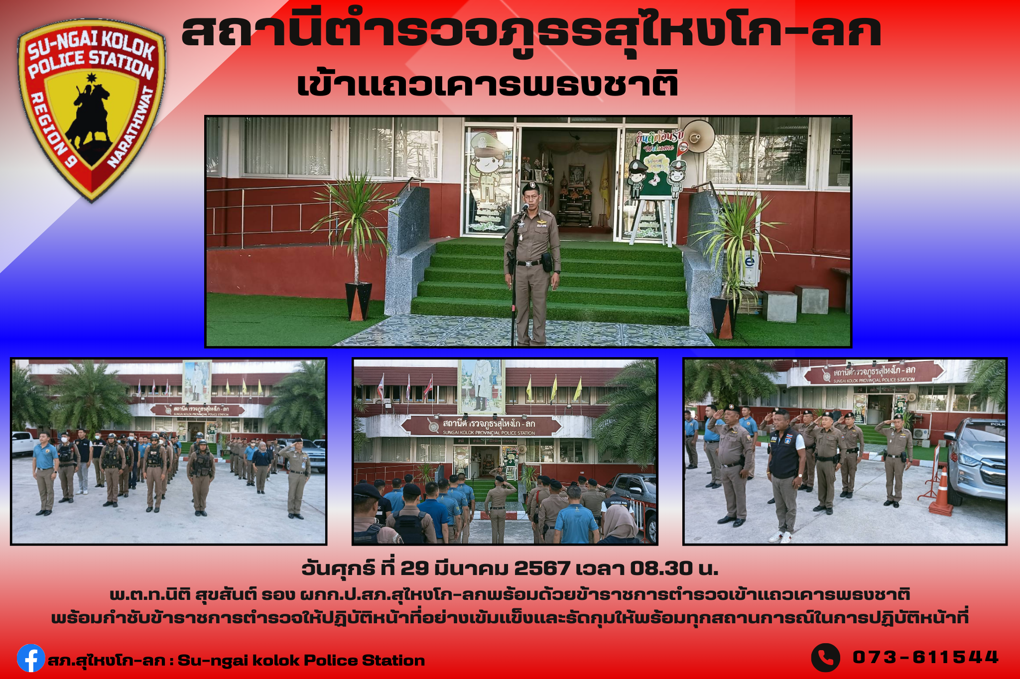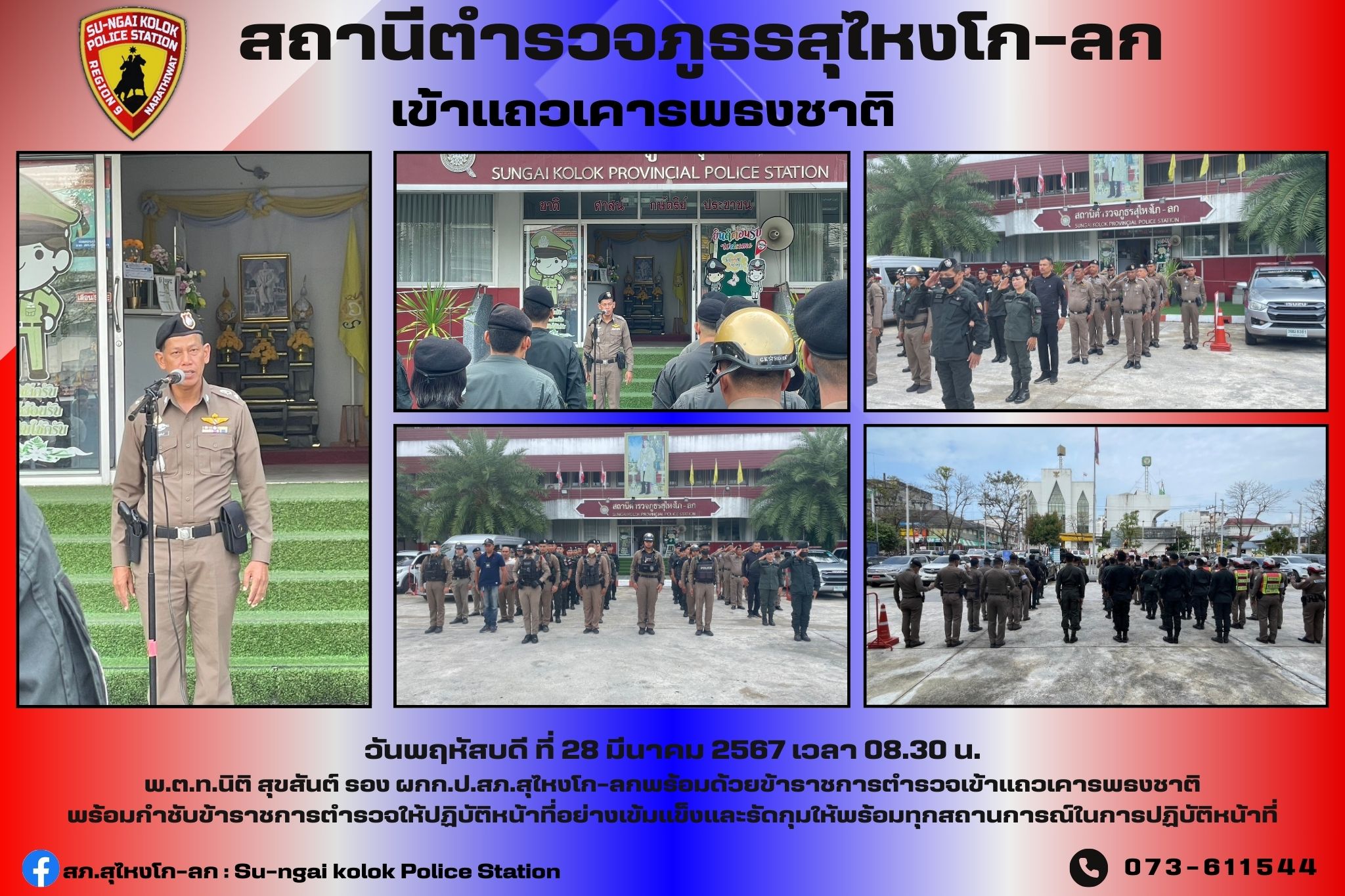 วันที่ 29 มีนาคม 2567ภายใต้อำนวยการของพ.ต.อ.เจษฎาวิทย์ อินทร์ประพันธ์ผกก.สภ.สุไหงโก-ลกพ.ต.ท.นิติ สุข