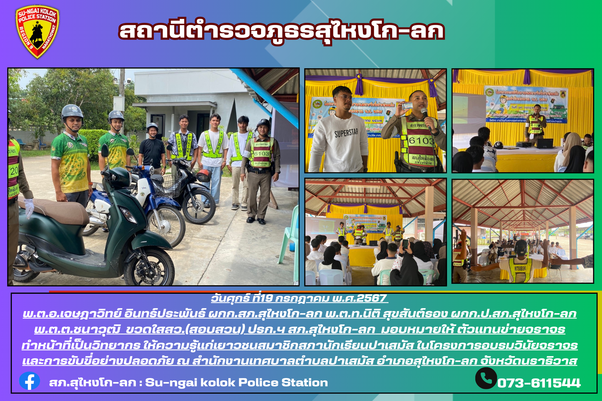 ข่ายจราจรทำหน้าที่เป็นวิทยากร ให้ความรู้แก่เยาวชนสมาชิกสภานักเรียนปาเสมัส ในโครงการอบรมวินัยจราจรและการขับขี่อย่างปลอดภัย ณ สำนักงานเทศบาลตำบลปาเสมัส อำเภอสุไหงโก-ลก จังหวัดนราธิวาส 19 กรกฎาคม 2567 โดย admin