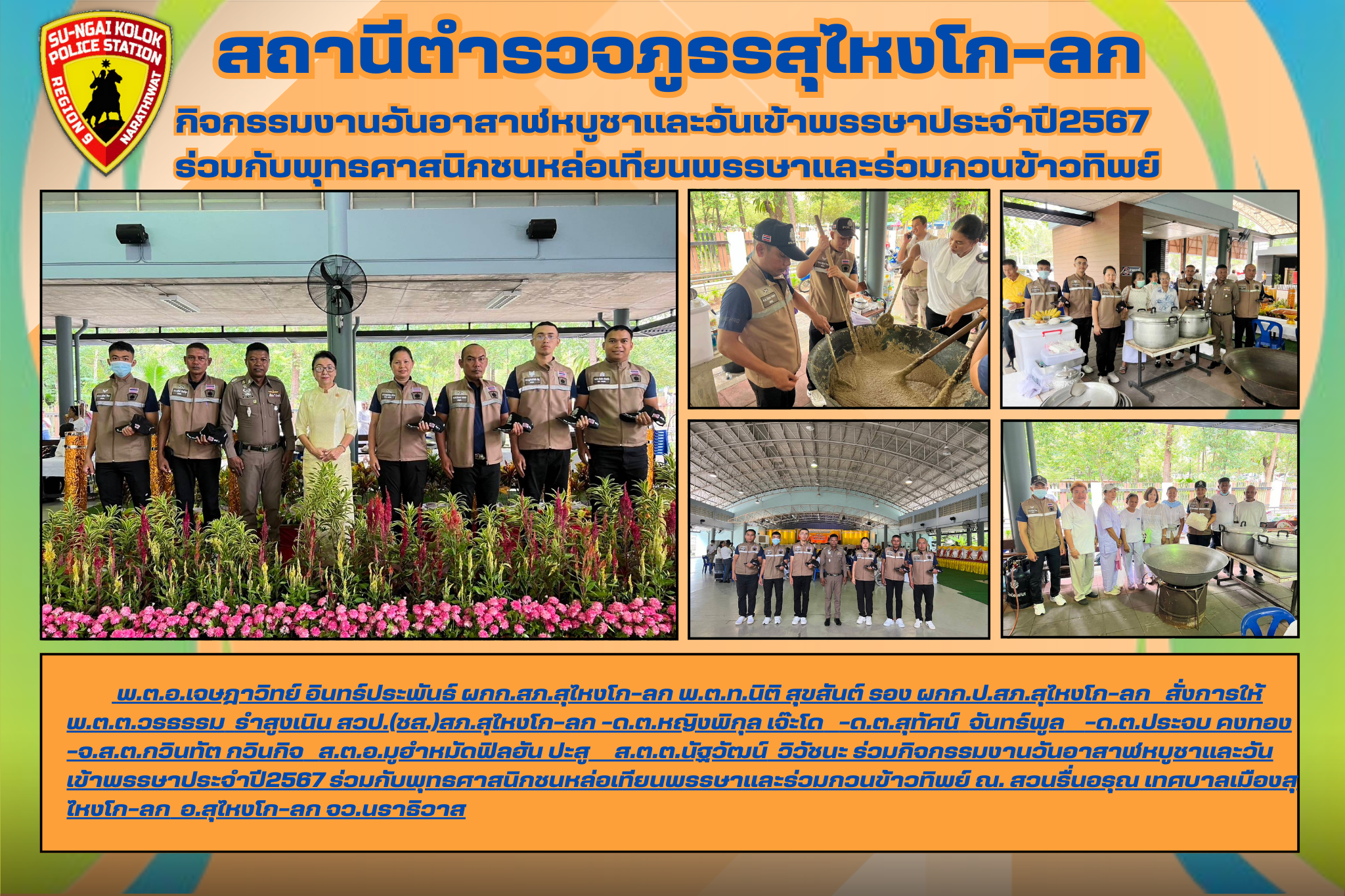 ร่วมกิจกรรมงานวันอาสาฬหบูชาและวันเข้าพรรษาประจำปี2567 ร่วมกับพุทธศาสนิกชนหล่อเทียนพรรษาและร่วมกวนข้าวทิพย์ณ. สวนรื่นอรุณ เทศบาลเมืองสุไหงโก-ลก อ.สุไหงโก-ลก จว.นราธิวาส 19 กรกฎาคม 2567 โดย admin