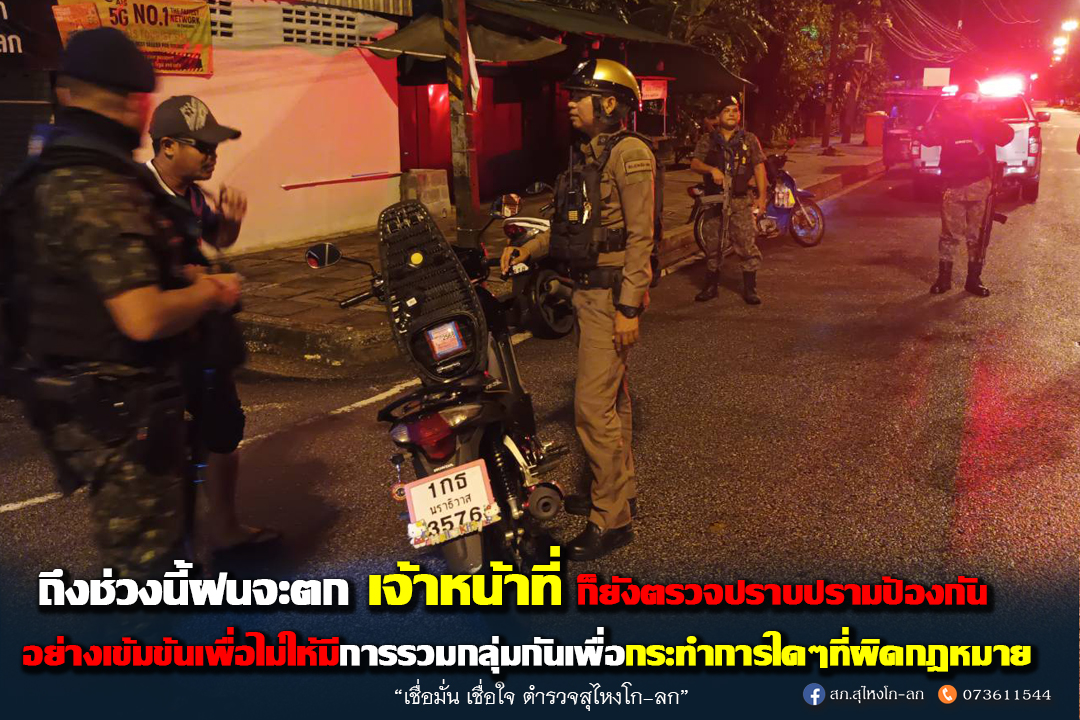 วันที่ 21 พ.ย.67 เวลา 17.00 น. ถึงเวลา 01.00 น.ภายใต้การอำนวยการของ พ.ต.อ.เจษฎาวิทย์ อินทร์ประพันธ์ผกก.สภ.สุไหงโก-ลกพ.ต.ท.นิติ สุขสันต์รอง ผกก.ป.สภ.สุไหงโก-ลกมอบหมายให้พ.ต.ท.กันตพล ทองนุ้ยสวป.สภ.สุไหงโก-ลกร.ต.อ.เสกสรรค์ ดือราแม(ร้อยเวร 20) พร้อม ชป.ที่ 3-ว.4 ว.43 ตามมาตราการปราบปรามการแข่งรถบนท้องถนน และเพื่อป้องกันไม่ให้มีการรวมกลุ่มกันเพื่อกระทำการใด ๆ ที่ผิดกฎหมายในพื้นที่รับผิดชอบ
