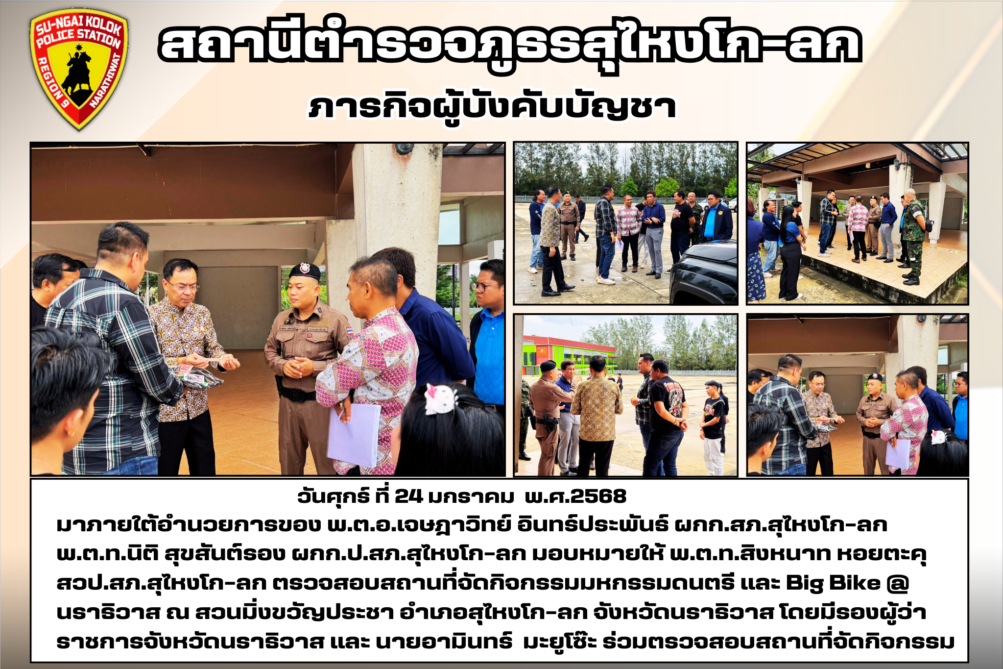 วันที่ 28 ม.ค.68 เวลา 17.00 น. ถึงเวลา 01.00 น.ภายใต้การอำนวยการของพ.ต.อ.เจษฎาวิทย์ อินทร์ประพันธ์ ผกก.สภ.สุไหงโก-ลกพ.ต.ท.นิติ สุขสันต์ รอง ผกก.ป.สภ.สุไหงโก-ลกมอบหมายให้พ.ต.ท.กันตพล ทองนุ้ย สวป.สภ.สุไหงโก-ลกร.ต.ท.เสกสรรค์ ดือราแม(ร้อยเวร 20) พร้อม ชป.ที่ 3-ว.4 ว.43 ตามมาตราการปราบปรามการแข่งรถบนท้องถนน และเพื่อป้องกันไม่ให้มีการรวมกลุ่มกันเพื่อกระทำการใด ๆ ที่ผิดกฎหมายในพื้นที่รับผิดชอบ-ลาดตระเวนจุดเสี่ยงที่อาจมีการวมกลุ่มแข่งรถ หรือก่อความเดือดร้อนรำคาญ(เปิดไฟวับวาบ)